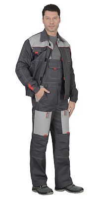 Костюм состоит из куртки и полукомбинезона. Ткань: 65% ПЭ, 35% ХБ, поверхностная плотность 215 г/кв.м. Цвет: т.серый с серым. Кант красный. Куртка укороч., с потайной застёжкой на "молнию". П/комб. с наколенниками-карманами. ГОСТ 12.4.280-2014.