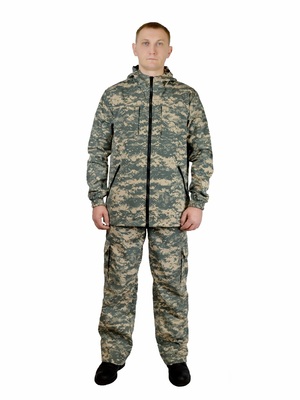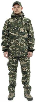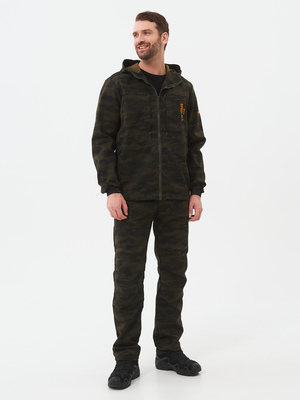 Костюм состоит из укороченной куртки с капюшоном и брюк. Застежка куртки на тесьму-молния с ветрозащитным клапаном, накладные многофункциональные карманы. Ткань Смесовая с ВО пропиткой 35% хлопок 65% полиэфир плот 210 г/кв.м, подкладка куртки Сетка 100% полиэфир, цвет КМФ степь.