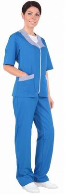 Комплект состоит из блузы с коротким рукавом и брюк. Ткань смесовая, 65%, п/э, 35 % виск, пл.150 г/м.кв, цвет василек. ГОСТ 9896-88