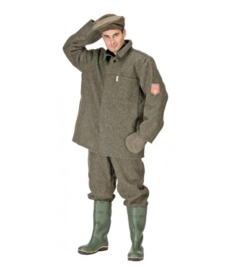 Куртка, брюки, берет, тк.сукно с кислотозащитной пропиткой, КЩС 80% , пл. 760 г/кв.м, серое. Состав: 90% шерсть, 10% лавсан. Куртка с пот. застёжкой на пуговицы, отложным воротником, карманами. Брюки с застёжкой гульфика на пуговицы. ГОСТ 27652-88.