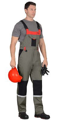 Полукомбинезон с бретелями, которые регулируются спереди с помощью пряжек-фастекс. Бретели из ткани и резинки сзади. Правая бокавая застежка на пуговицах. Центральная застежка на молнию. Грудка с большим накладным карманом с фигурным клапаном на липучку. Под поясом расположены боковые карманы. Слева на боковом шве расположен накладной объемный карман с фигурным клапаном на липучке. Спереди усилительные наколенники. Полукомбинезон сзади с накладными карманами, у бокового шва справа плоские накладные карманы для инструментов, один на другом, внизу которых декоративная тесьма с пряжкой. По талии спереди и сзади шлевки. Сзади резинка, для лучшего прилегания по фигуре. Предусмотрены световозвращающие элементы для обозначения сигнальной видимости. Ткань верха смесовая, состав: 65% ПЭ, 35% ХБ, Цвет: Оливковый. Плотность: 245 г/кв.м. Световозвращающий материал: СВ кант, СОП 50 мм