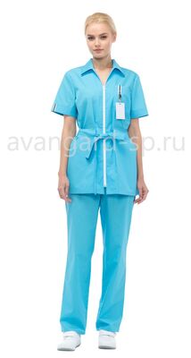 Ткань смесовая (65% полиэфир, 35% хлопок), 120 г/м.кв., ВО. Цвет: темно-синий. Комплект из блузы и брюк. Блуза удлиненная прямого силуэта, с застежкой на молнию и поясом по талии. Воротник отложной. Нагрудный карман с тесьмой и кольцом для крепления бейджа. Нижние накладные карманы со шлевками для пояса. На спинке длинная шлевка для крепления пояса. Втачные короткие рукава с декоративным отворотом по низу. По низу блузы, по боковым швам, небольшие разрезы. Брюки прямого силуэта с эластичным поясом по талии.