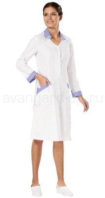 прилегающий силуэт, отложной двойной воротник на стойке, регулировка по талии Цвет: белый, светло-сиреневая отделка¶Ткань: смесовая «ТиСи» пл.120 г/м2, ВО