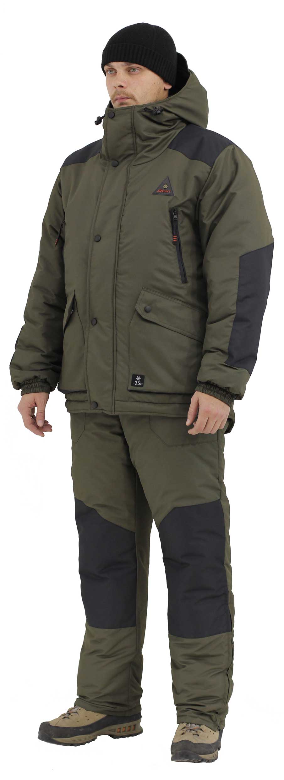 Куртка - прямая модель удлинненная сзади. Куртка три слоя утеплителя, полукомбинезон два слоя утеплителя. Подклад лопатки флис. Молния "Трактор-8мм", два бегунка. Куртка четыре кармана, плюс один карман на молнии внутри. Капюшон с флисом внутри имеет козырёк . Кулиска-утяжка на поясе внутри куртки. Усиления на локтях, плечах и коленях. Полукомбинезон два кармана, низ брючин расстегивается для сапог ЭВА. Температура в активном режиме -35°C.Ткань Таслан. Показатель мембраны 5000 / 5000.