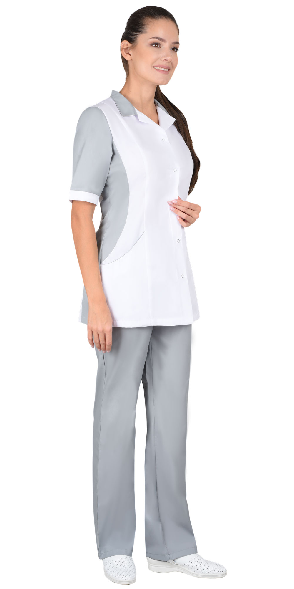 Костюм белый с серым, состоит из блузы и брюк. Ткань смесовая, состав: 40% ПЭ; 60% ХБ, плотность 155 г/кв.м. Блуза полуприлегающего силуэта, с центральной застёжкой на рубашечные кнопки. Воротник отложной с лацканами. На полочке расположены верхний накладной и нижние внутренние фигурные карманы. Рукава втачные, укороченные с манжетами. Детали блузы выполнены из отделочной ткани в цвет брюк. Брюки прямого силуэта, с застёжкой гульфика на тесьму «молния». Пояс притачной, застёгивающийся на петлю и пуговицу. Ширина пояса регулируется эластичной тесьмой в области боковых швов.¶ГОСТ 25294-2003, ТР ТС 017/2011