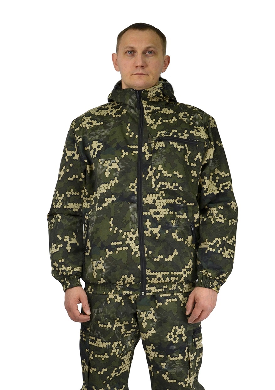 Камуфлированный универсальный летний костюм для охоты, рыбалки и активного отдыха. Ткань: Гретта (35% хлопок, 65% полиэфир),пл.210 г/м2,ВО. Комплектность Куртка с капюшоном, брюки. ¶Куртка укороченная:¶- регулируемый капюшон,¶- центральная застежка молния,¶- боковые и нагрудный карманы на молнии,¶- пояс и манжеты на резинке.¶Брюки:¶- пояс и низ брюк на резинке,¶- на передних половинках брюк карманы в швах,¶- по бокам накладные карманы на молнии.