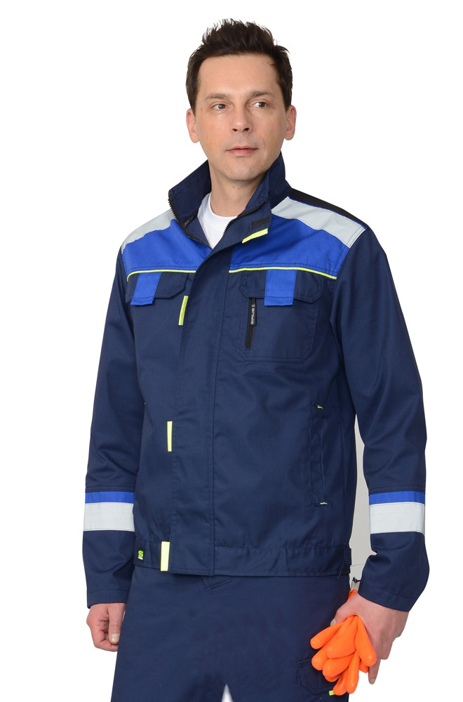 Цвет: темно-синий с васильковой и чер. отделкой. Ткань. Rodos 35%-х/б, 65%-п/э, поверхностная плотность 245г/м2. Куртка прямого силуэта, короткая, с воротником стойка, с центральной застёжкой на тесьму-"молнию" накрытую ветрозащитным клапаном на липучках, с нижними прорезными карманами с листочкой, с притачным поясом регулирующимся по ширине при помощи хлястиков и липучки. ГОСТ 27575-87