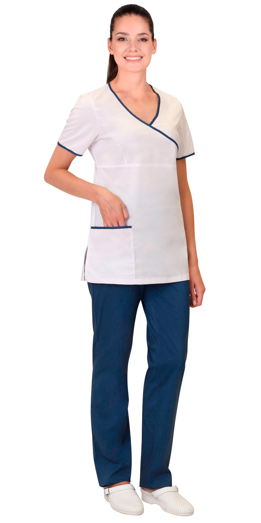 Блуза, брюки. Материал — Тиси-Стрейч , состав — 75% ПЭ 22% ХБ 3% СП. Плотность — 115г/кв.м. Костюм женский комбинированный из ткани двух цветов состоит из блузы белого цвета и брюк синего цвета. Блуза полуприлегающего силуэта, без застёжки, с V – образным вырезом, с накладным карманом, с втачными короткими рукавами. Горловина, низ рукавов и верх кармана окантованы косой бейкой из ткани отделка. Блуза с завязывающимся сзади поясом. Брюки прямые с притачным поясом стянутым резинкой.