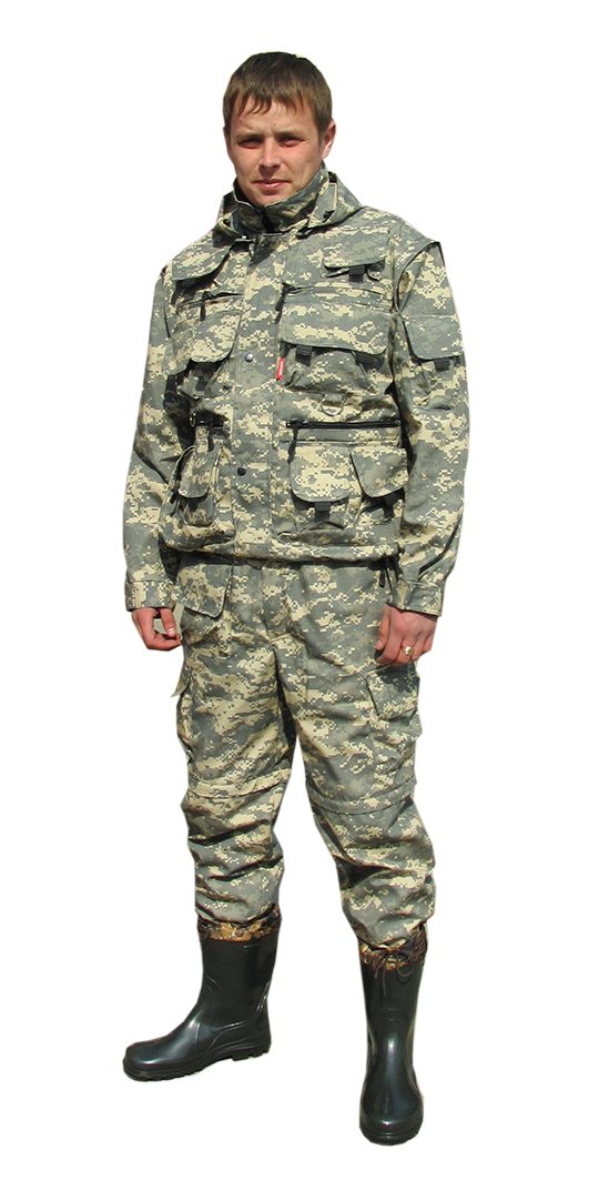 Костюм состоит из укороченной куртки с капюшоном и брюк. Застежка куртки на тесьму-молния с ветрозащитным клапаном, накладные многофункциональные карманы. Ткань Рип-Стоп с ВО пропиткой 35% хлопок 65% полиэфир плот 210 г/кв.м, подкладка куртки Сетка 100% полиэфир, цвет КМФ пустыня.