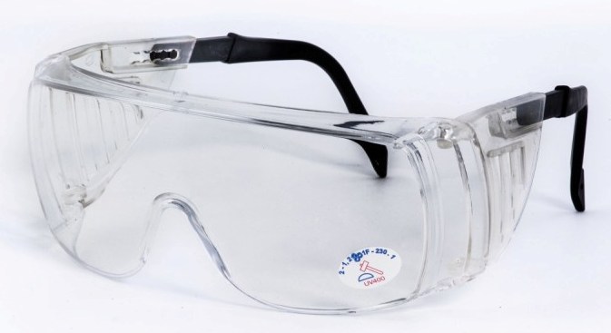 Очки прозрачные из ударопрочного поликарбоната с увеличенной боковой и верхней защитой. Дужки регулируются по длине.