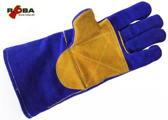 Выполнены из высококачественного синего спилка на подкладке из хлопковой ткани и флиса, длина 35 см. На ладони и большом пальце дополнительное усиление из желтого спилка, что увеличивает износоустойчивость и защитные свойства при механических работах и увеличивает защиту от повышенных температур, брызг и расплавленного металла. Наличие мягкой флисовой подкладки повышает комфорт использования и позволяет использовать краги в зимнее время. Швы прошиты нитью Кевлар и усилены вставками из кожи.