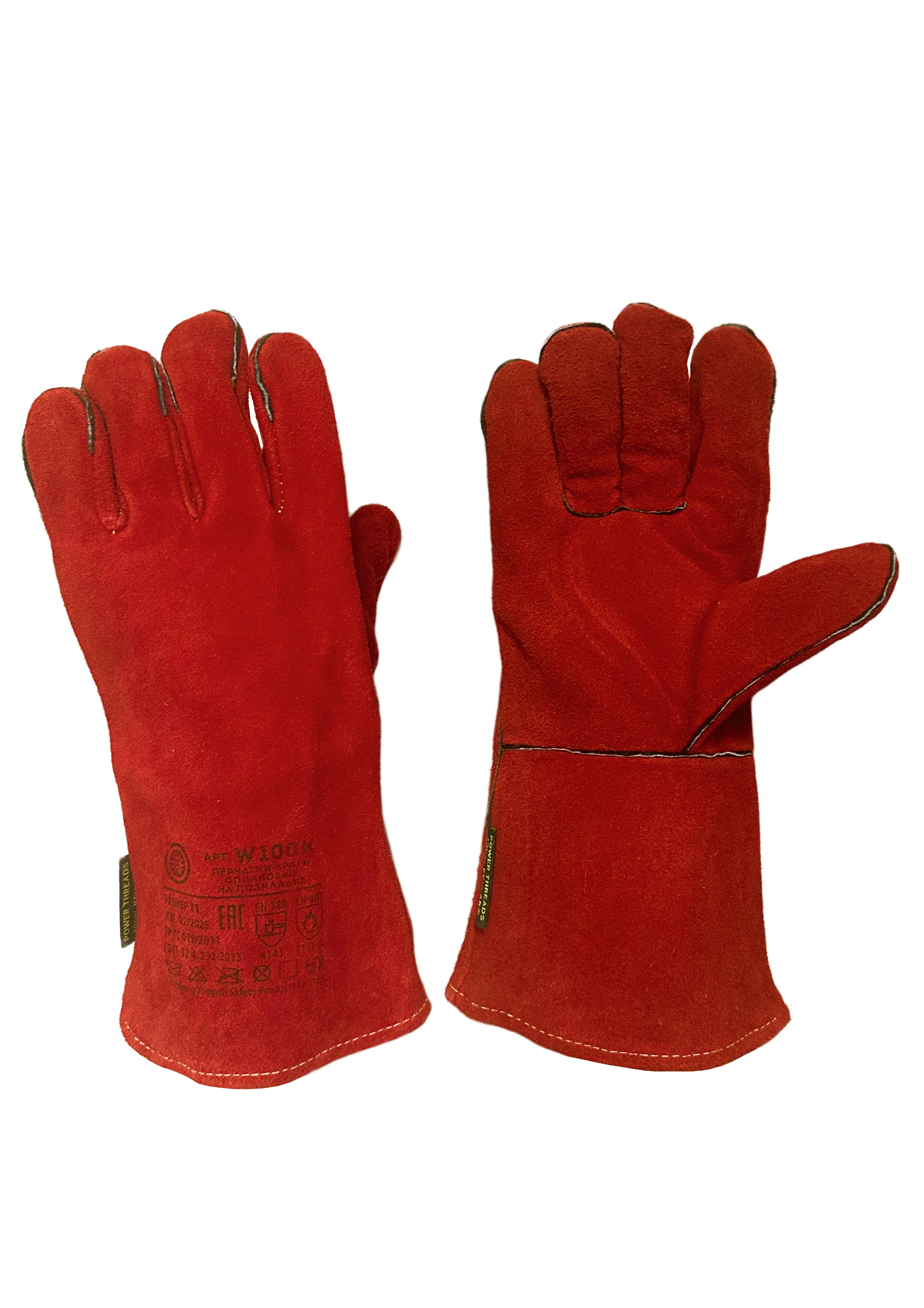 Краги сварочные из спилковой кожи КРС, толщина спилка 1,2-1,4мм. Прошитые нитью Kevlar. С хлопчатобумажной подкладкой. Длина 350 мм. Цельная ладонь. Красные. EN 388 (4243), EN 407 (413Х4Х), ТР ТС 019/2011