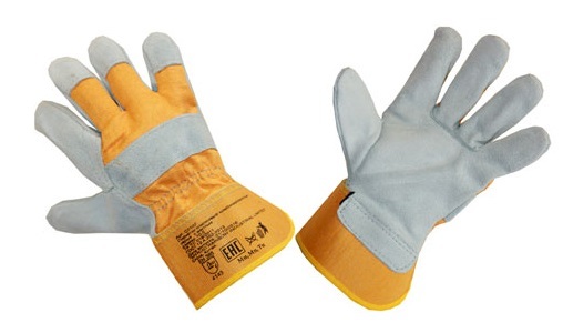 Перчатки рабочие пятипалые, шитые из кожевенного спилка, комбинированные хлопчатобумажной тканью. Усиленная ладонь