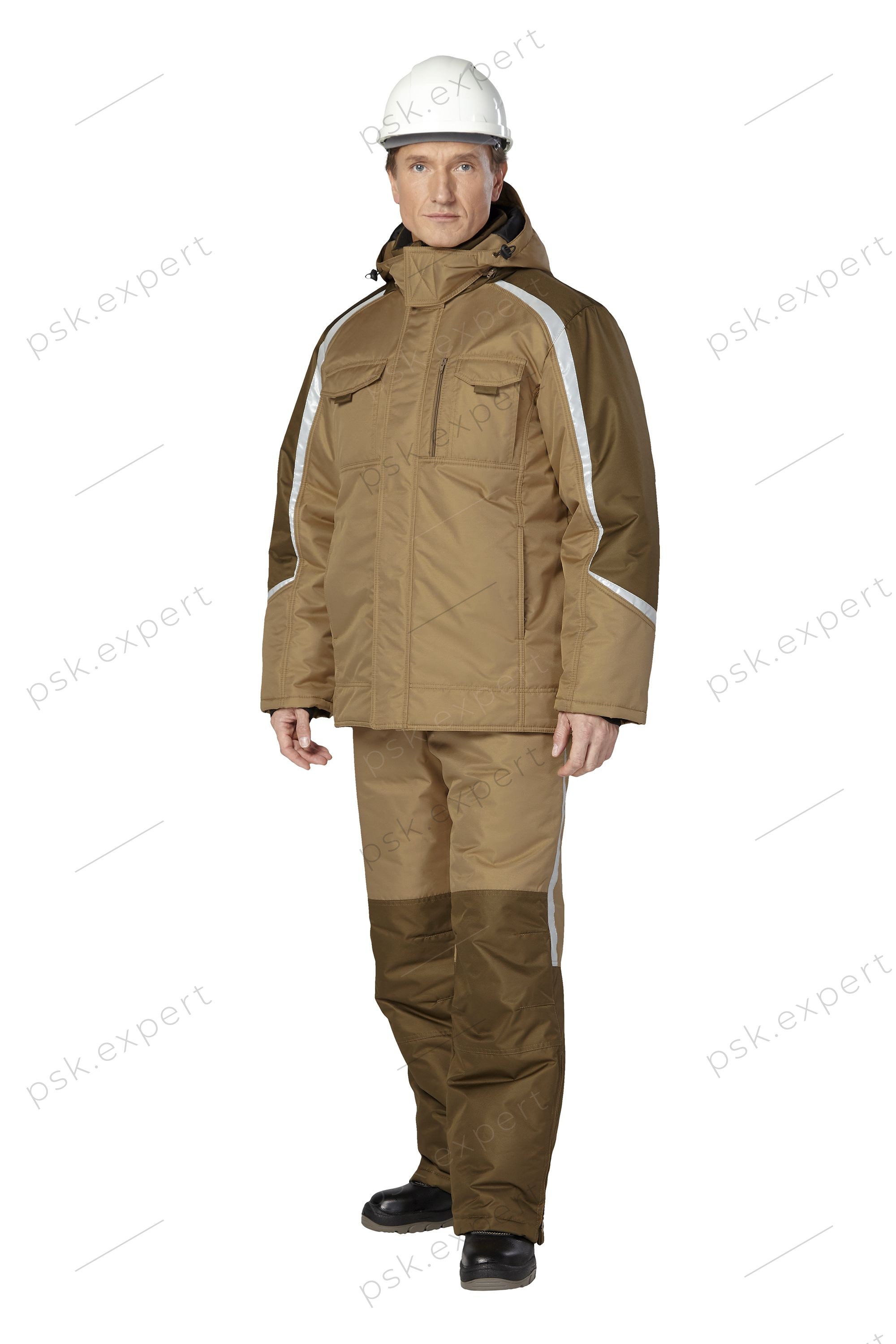 Костюм из куртки и брюк 2 класса защиты от пониженных температур (III климатический пояс). Цвет Хаки/Бежевый. ¶Материал : 170 г/м², 100% ПЭ, покрыт Ultra WR, AntiFrost, Cats eye¶Утеплитель : Синтепон 120г/м² (куртка 3сл., брюки 2сл)¶Подклад: ПЭ 100%, термостеганый