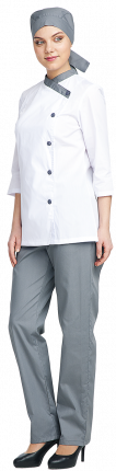 Комплект состоит из куртки, брюк, банданы. Куртка: полуприлегающего силуэта, смещённая бортовая застёжка на петли и пуговицы, воротник — стойка из отделочной ткани, рукава втачные 3/4. Брюки: прямые по всей длине, пояс с эластичной лентой. Бандана с завязками. Цвет: белый-серый, Ткань: 'тиси', Состав: 35%х/б 65%п/э пл.120г/м2