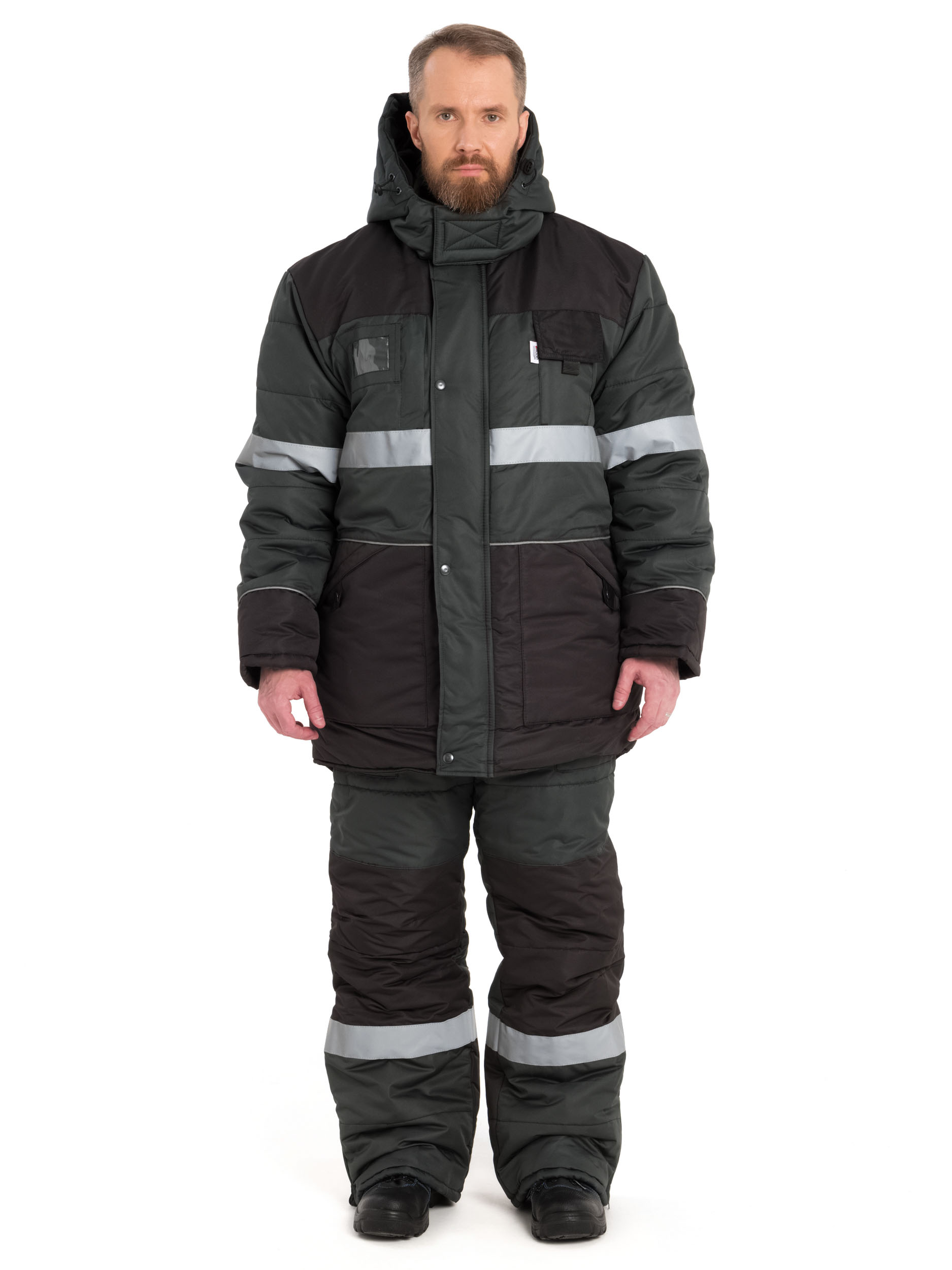 Куртки и полукомбинезона. Куртка со светоотражающими полосами и кантом, с центральной застежкой на молнию, ветрозащитным клапаном на текстильную застёжку с чередованием кнопок и внутреннюю планку с уголком для защиты подбородочной части от молнии. Воротник стойка, с внутренней стороны флис, съёмный утеплённый капюшон. На правой полочке нагрудный карман для бейджа с прозрачной защитной плёнкой. Рукава с внутренними полушерстяными манжетами. Удлинённая по низу спинка. Внутренняя ветрозащитная юбка с застёжкой на кнопки. Полукомбинезон со светоотражающими полосами, с центральной застёжкой на молнию и планку с текстильными застёжками, на регулируемых по длине бретелях. На левой передней половинке нагрудный карман для сотового телефона. По низу брючин расположены разрезы на молниях с внутренними пуфтами для облегчения одевания на зимнюю обувь. МатериалТкань Taslan 228 Milky PU, пл.135 г/м2 (100% нейлон с нанесением полиуретанового покрытия)¶Утеплитель: куртка - Аэрофайбер 300 г/м2, Termofinn Plus 150г/м2; полукомбинезон - Аэрофайбер 150г/м2, Termofinn Plus 150 г/м2¶Подкладкатаффета 190Т (100% полиэфир)¶Климатический пояс IV и ОСОБЫЙ