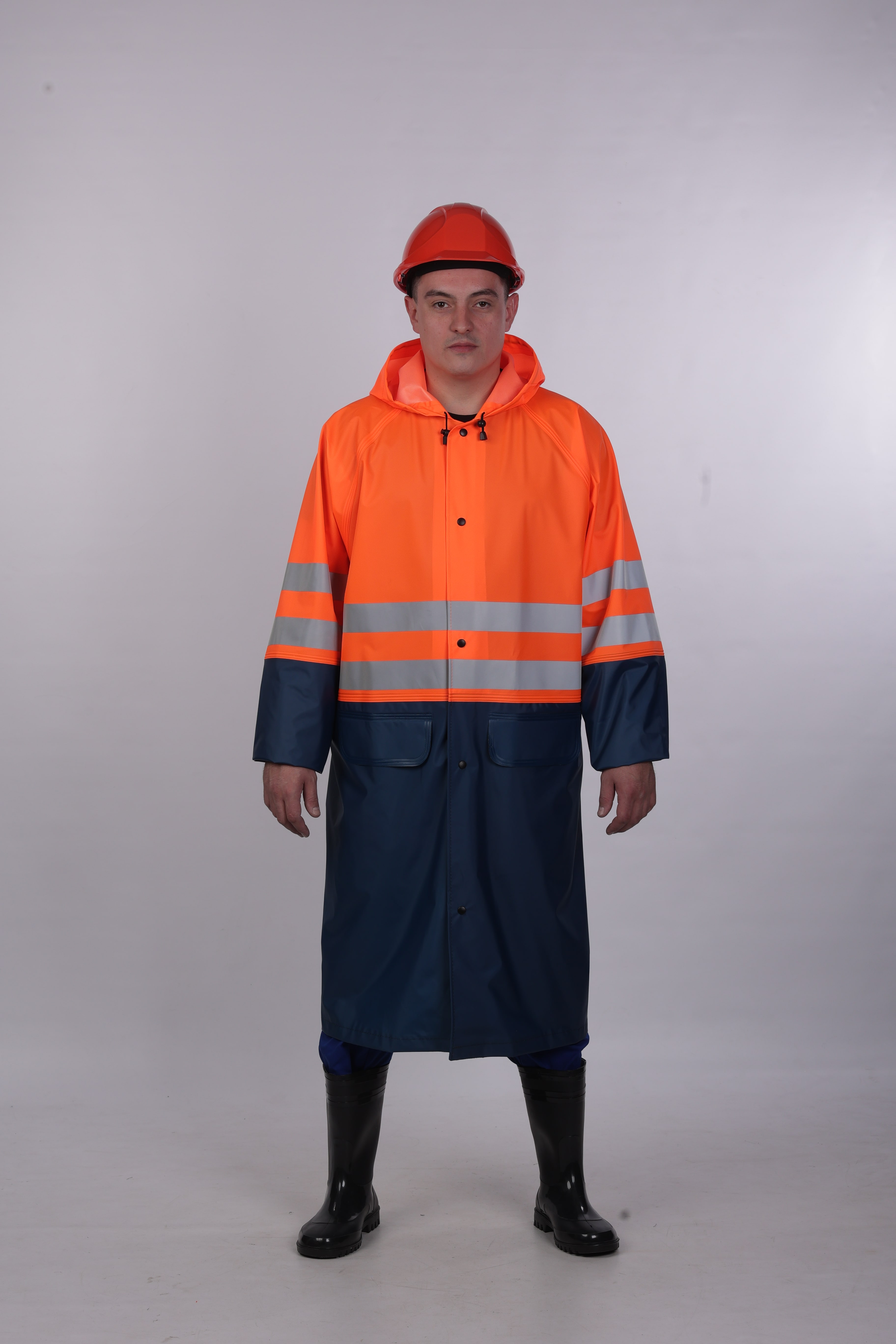 Плащ сигнальный повышенной видимости 3 кл. защиты, для защиты от воды 3 кл. защиты, из материала с ПВХ покрытием, фонового материала флуоресцентного оранжевого, с ПВХ покрытием, с НМВО, К80, Щ4. Предназначен для использования в качестве дежурной одежды. Обеспечивает защиту от¶воды, ветра, общих производственных загрязнений, нефти, нефтепродуктов, масел и¶жиров, кислот в условиях ограниченной видимости и в темное время суток.¶Застежка на кнопках.¶Капюшон надевается на каску, регулируется кулисой со шнуром по лицевому вырезу и¶затяжником на затылочной части.¶Защитные элементы сварные швы, кнопки по низу рукавов для фиксации ширины.¶Карманы прорезные, с защитными клапанами.¶Вентиляционные отверстия на кокетке спинки закрыты клапаном, люверсы в области¶пройм.¶Светоотражающие полосы в два ряда на кокетке и рукавах.