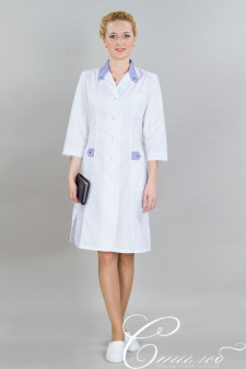 Халат женский прилегающего силуэта с центральной бортовой застежкой на кнопки. Воротник стояче – отложной, переходящий в отложные лацканы. Рукав ¾. Два нижних накладных кармана. Стойка, верхний хлястик спинки, паты карманов выполнены из отделочных тканей. Отделка белая, сиреневая. ТКАНЬ¶ TC, пл. 120 г/м2¶СОСТАВ¶ 65%-полиэстер, 35%-хлопок¶ВИД ЗАСТЕЖКИ¶ Кнопки¶Длина рукава¶ 3/4