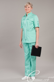 Костюм женский полуприлегающего силуэта с центральной бортовой застежкой на тесьму «молнию». Рукав короткий. Воротник стойка. Два нагрудных и два внутренних кармана с наклонным входом. Брюки прямые. Пояс цельнокроеный с эластичной тесьмой. Цвет: белый, мята, голубой.