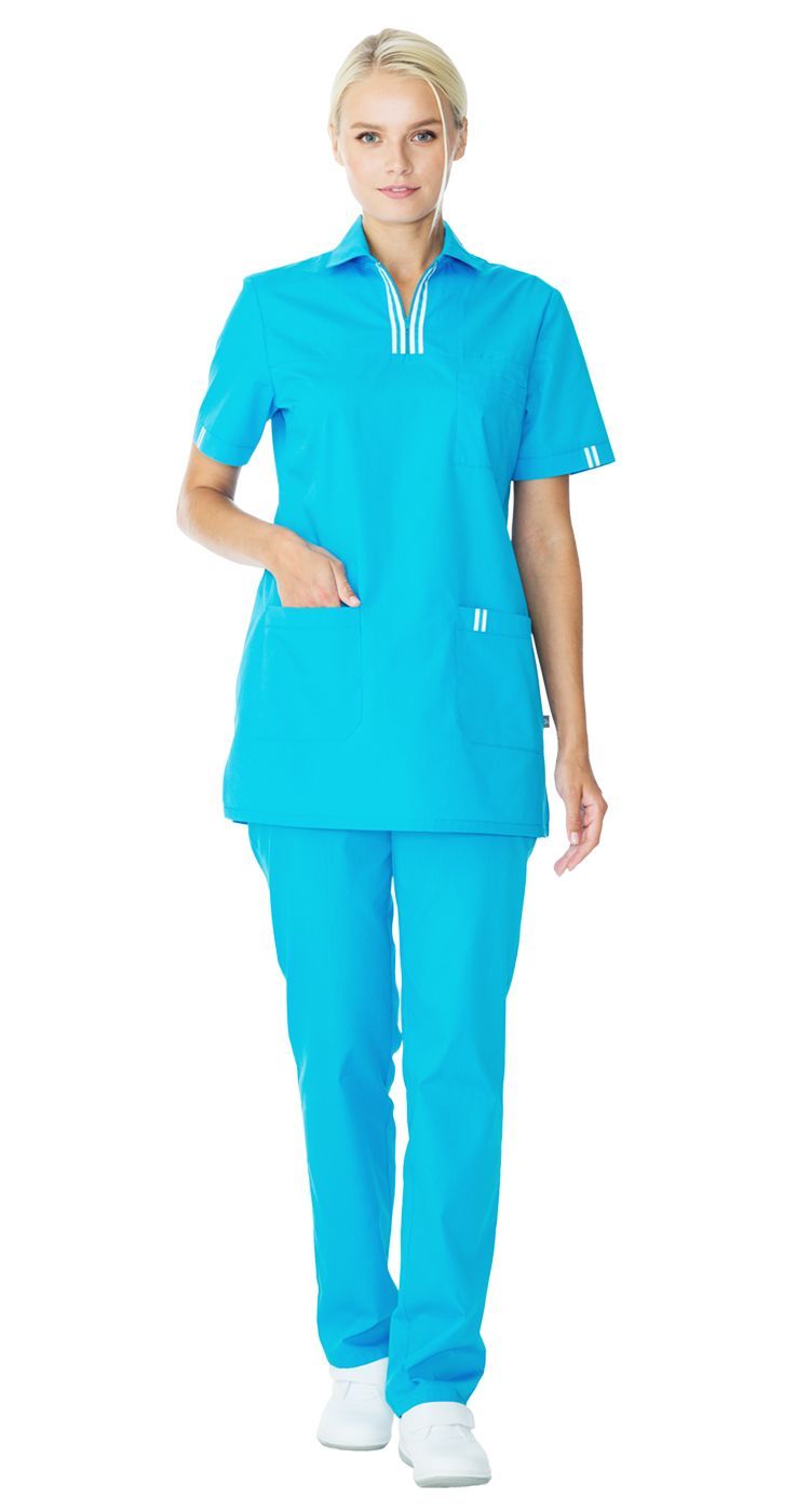 Цвет: ярко-голубой. Ткань смесовая «Тиси» (65% полиэфир, 35% хлопок) пл.120 г/м.кв. Комплект состаит из блузы и брюк. Блуза прямого силуэта с разрезами в боковых швах. Воротник отложной, застежка на «молнию» до горизонтальной кокетки и декоративной лентой. Есть один маленький нагрудный и два больших нижних накладных кармана. На рукавах, левом нижнем кармане и воротнике отделка из декоративной ленты.¶Брюки умеренного объема на резинке; пояс с резинкой из основной ткани.