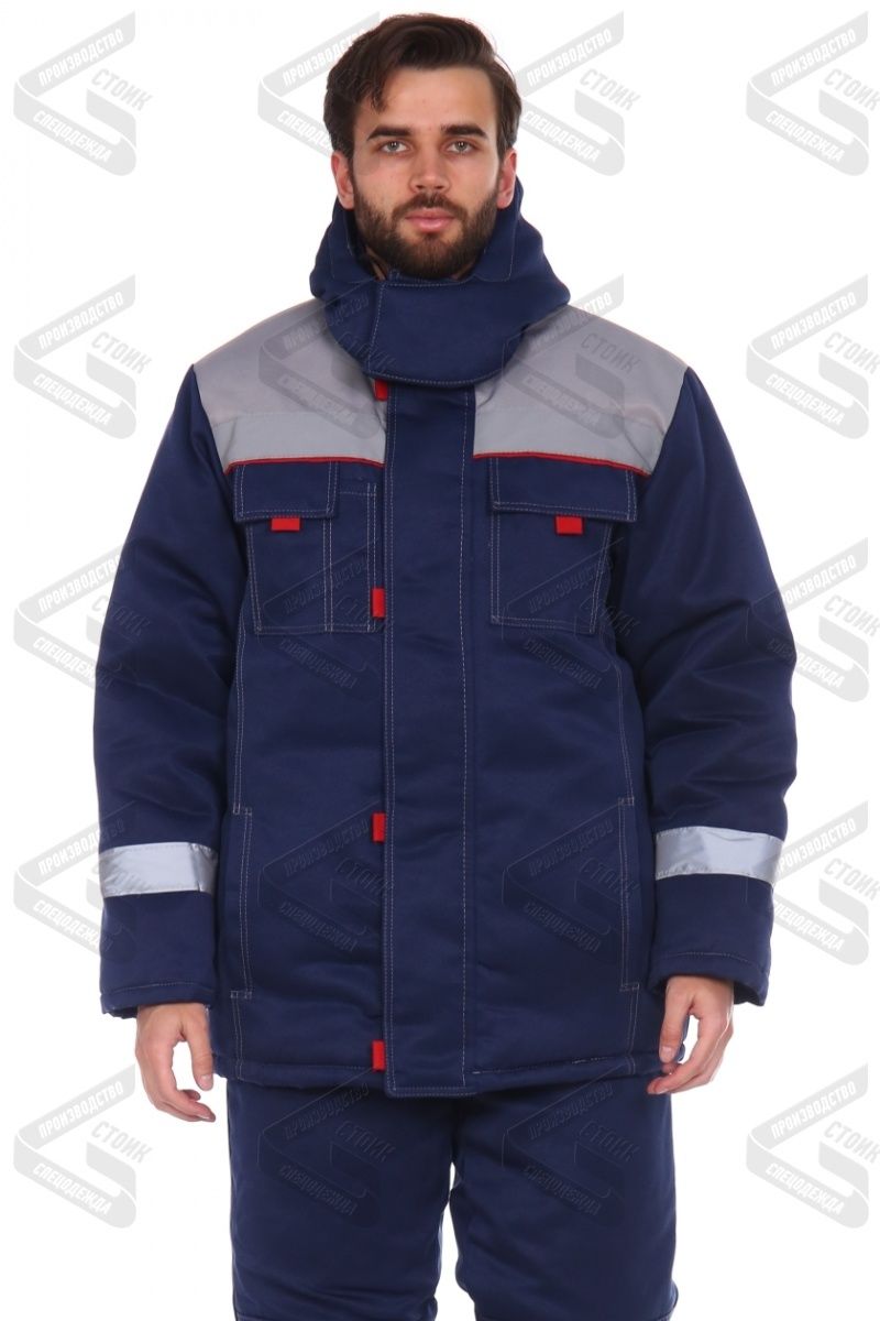 Цвет: основной – синий, отделка – серая. Ткань: смесовая Грета, пл. 210 гр/кв.м;. Утеплитель: синтепон, в куртке 580, в полукомбинезоне 435 гр/кв.м; Подкладка: 100% ПЭ + ветрозащитная ткань; Защитные св-ва: Тн, З, Ми. климатический пояс - 4. - Куртка утеплённая: крой прямой, удлиненная, съемный капюшоном. Полочки с рельефными вертикальными швами.¶Воротник: стойка, внутренняя сторона на флисе.¶Центральная застежка: двойная ветрозащитная планка, молния 2-х замковая. Планки утепленные. Верхняя планка застегивается на 5 контактов текстильной застежки с флажками, цвет флажков-хлястиков красный.¶Карманы: нагрудные 2 шт — накладные, с клапаном, правый карман с отдельным кармашком для ручки; нижние 2 шт — в рельефных швах.¶Рукава: втачные, низ с притачными ветрозащитными юбочками, трикотажными манжетами.¶¶ - Полукомбинезон утеплённый: отрезной нагрудник, центральная застежка на тракторной молнии. Передние половинки с боковыми карманами в швах, вход наклонный.¶СОП: 50 мм по нижней части рукава, по шву притачивания кокетки, вкруговую по низу брючин.
