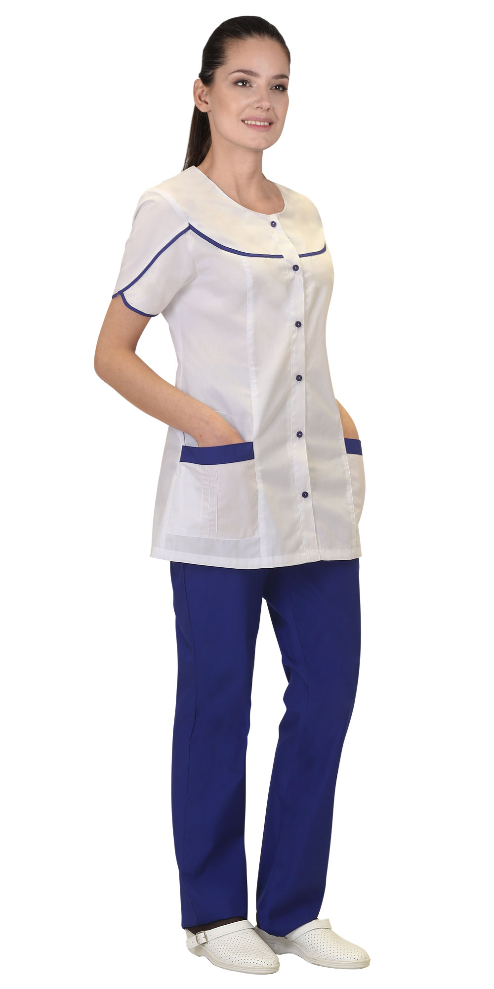 Блуза, брюки. Ткань смесовая с ВО пропиткой, состав — 65% ПЭ, 35% ХБ, плотность — 115г/кв.м. Костюм комбинированный из ткани двух цветов состоит из блузы белого цвета и брюк василькового цвета.¶Блуза полуприлегающего силуэта, с центральной застёжкой на петли и пуговицы. Овальный вырез, верхний нагрудный карман и два нижних накладных кармана, втачные короткие рукава. Нижний срез кокеток, шов рукава и нижний срез рукава окантованы косой бейкой из ткани отделка. Брюки прямые на притачном поясе, частично стянутом на эластичную тесьму, спереди на поясе вставка. ГОСТ 25294-2003