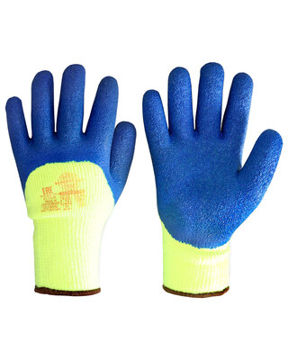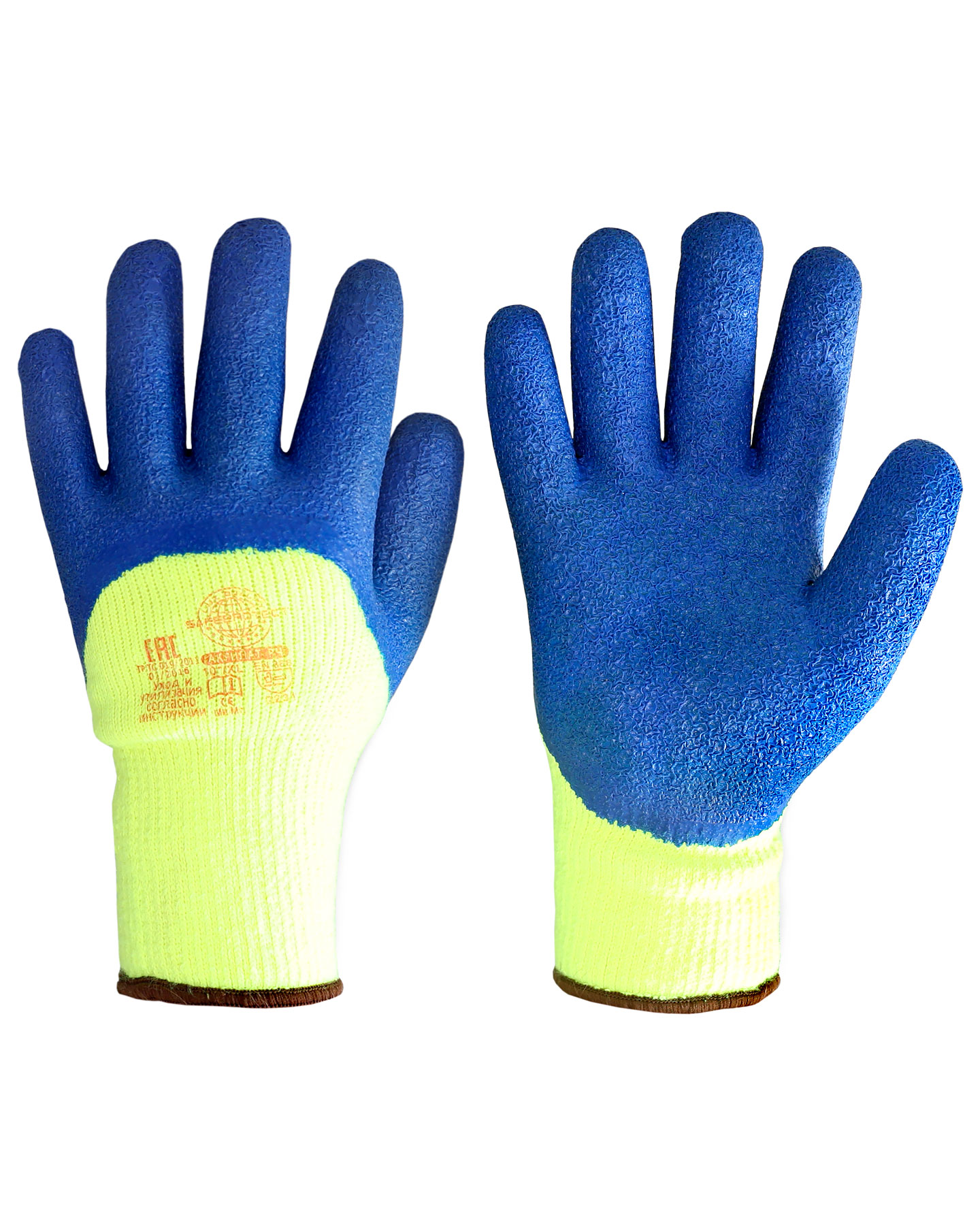 Перчатки утепленные из акрила 7-го класса вязки. Ворсовая подложка. Покрытие латексное 3/4 поверхности. Манжет вязанный. Губчатая поверхность. Защитное покрытие от кислот и щелочей. Подходят для механических работ при пониженной температуре. ГОСТ 12.4.252-2013, ГОСТ EN 388-2012, ГОСТ EN 511-2012, ТР ТС 019/2011