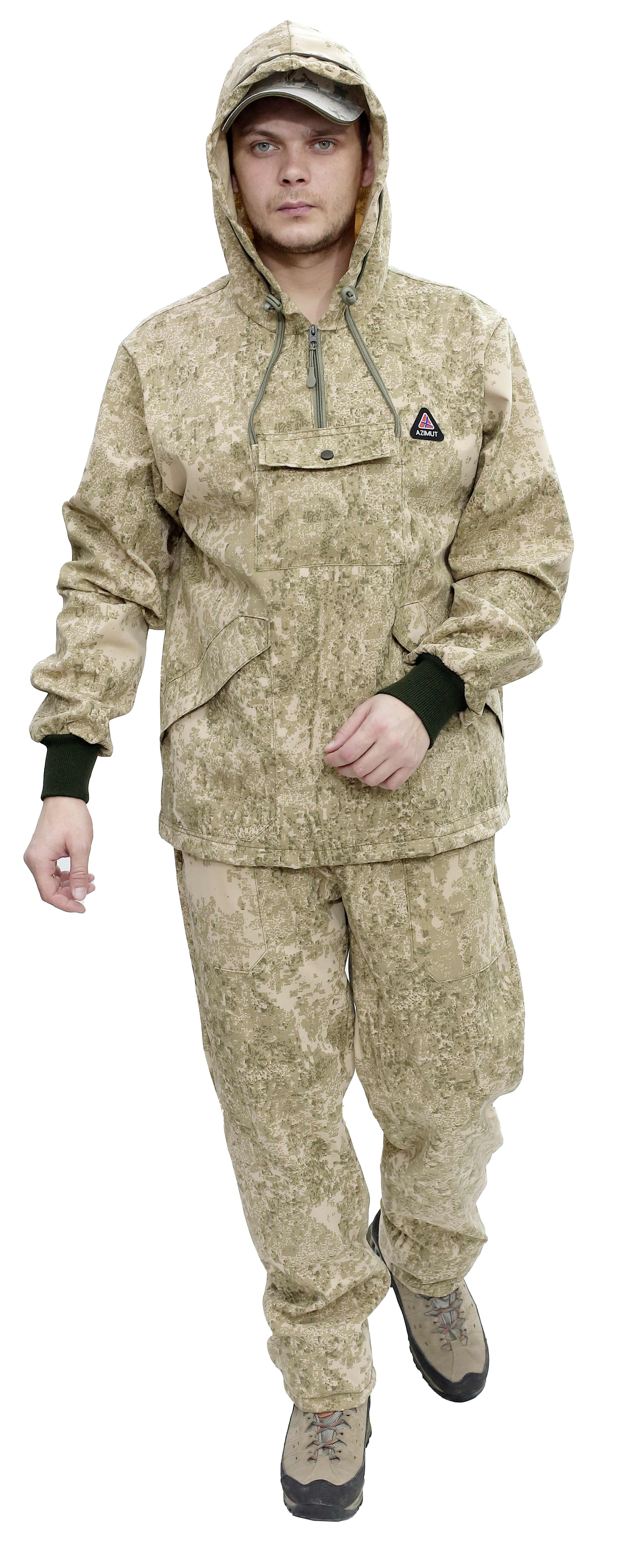 Куртка,брюки. Ткань смесовая TWILL, Состав: 65% ПЭ, 35% ХБ, плотность 210гр/м2. Костюм-анорак, одевается через голову. Куртка прямая с тремя карманами, один карман на груди с москитной сеткой. Регулировка по овалу лица на капюшоне. Регулировка по низу куртки. Регулировка низа брюк. Брюки пояс на резинке. Шлевки для ремня. Брюки 2 кармана.