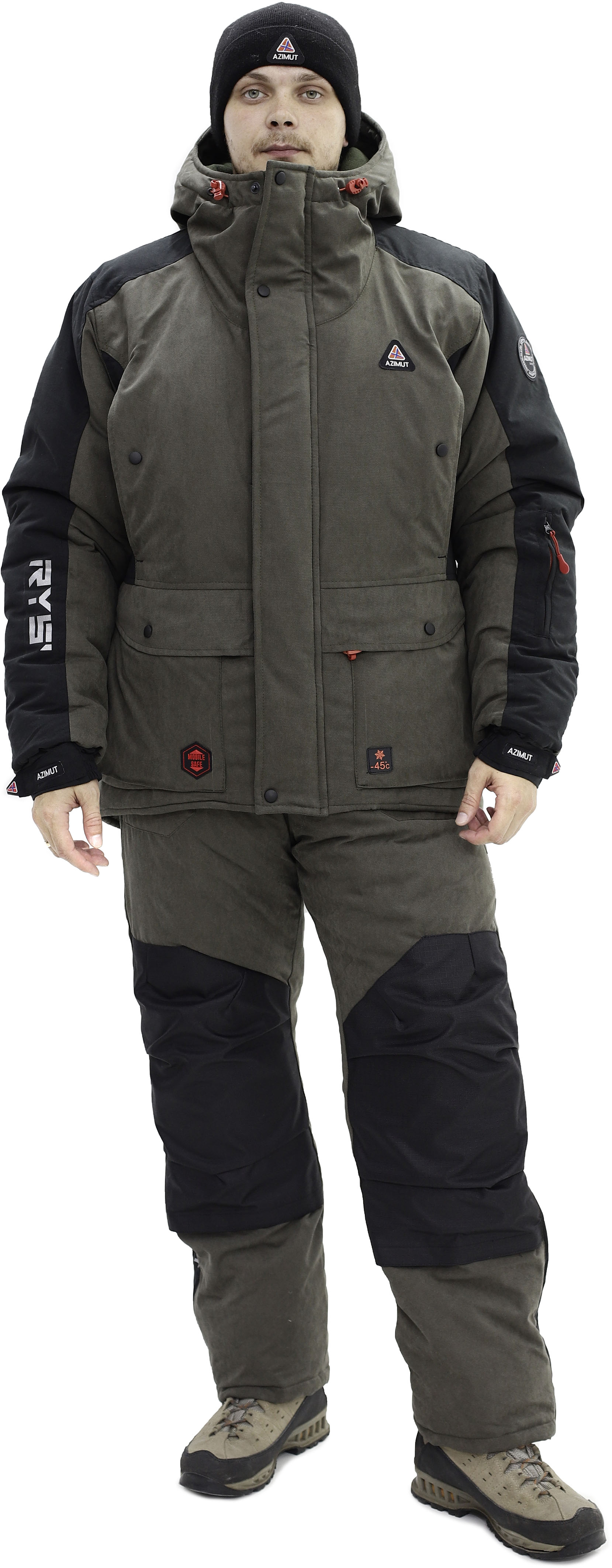 Ткань: Исландия, цвет: Хаки+Черн. Плотность: 190 гр/м2. Состав ткани: 65% пэ, 35% нейлон. Куртка пять карманов. Два больших нагрудных кармана с флисовым покладом. Пата на капюшоне для регулировки. Куртка имеет вшитый внутренний термометр, а так-же радиоэкранирующийй карман на молнии для смартфона. Подклад в куртке Hi-Tech(фольгированный). Внутри куртки два больших кармана формата А4. Высокий воротник. Полукомбинезон высокий имеет два кармана+нагрудный карман на молнии. С боков полукомбинезона трикотажные вставки для удобства наклона. На коленях вставки из ПВХ-4мм. Низ брючин расстегивается, имеет внутренние гетры от снега. Температура -45С