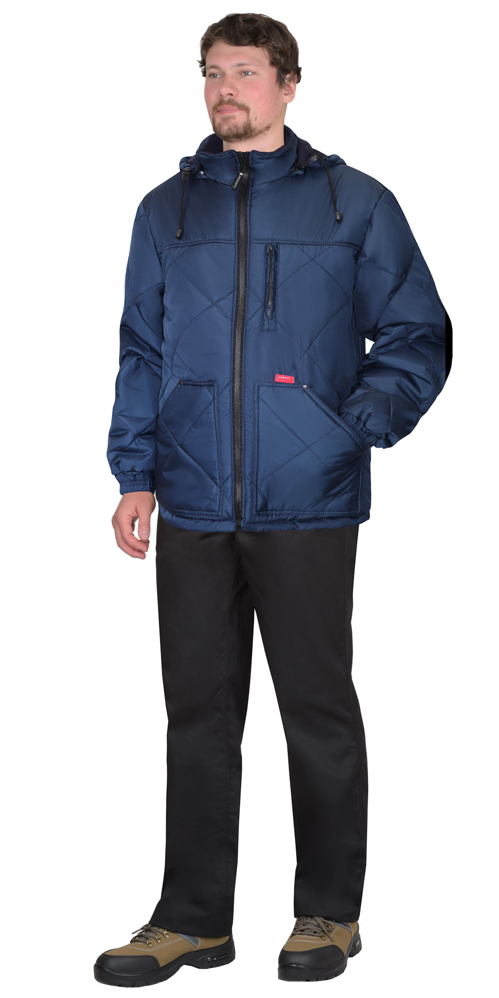 Куртка прямого силуэта с удлиненной спинкой, с центральной бортовой застёжкой на "молнию", пристегивающимся капюшоном, воротник - "стойка". Два накладных кармана. Рукава частично стянутые резинкой. Цвет: синий. Ткань Дюспа 100% п/э. Подклад флис 100% ПЭ. Утеплитель: Синтепон 150 гр/м.кв. 1 слой.
