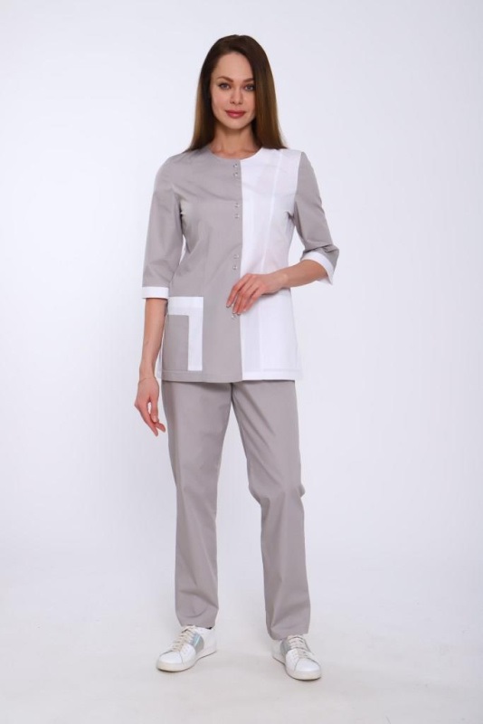 ЦВЕТ - Белый+серый. ТКАНЬ - TC, пл. 120 г/м2. СОСТАВ: 65%-полиэстер, 35%-хлопок. ВИД ЗАСТЕЖКИ - Кнопки. Длина рукава - 3/4