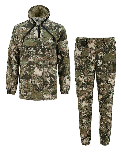 Камуфляжный антимоскитный костюм с ловушками выполнен из прочной, износостойкой ткани -Твил. Ткань имеет водоотталкивающую пропитку. Купить антимоскитный костюм предназначенный для защиты от кровососущих насекомых, имеющий антимоскитную сетку. Крой костюма – свободный. Костюм собирается только армированной нитью. Состоит костюм из куртки-анорак с капюшоном и брюк прямого кроя. Капюшон регулируется по объему, а съемная вставка из противомоскитной сетки застегивается на молнию, или убирается в карман на груди. Костюм оснащен специальными ловушками для клещей – на рукавах, куртке, брюках. Пояс брюк собран на широкую эластичную резинку, есть шлевки для ремня. Низ брюк на резинке. Основная ткань - смесовая, состав: 65% Полиэстер; 35% Хлопок. Плотность - 200 гр./м2. Пропитка - BO (WR)
