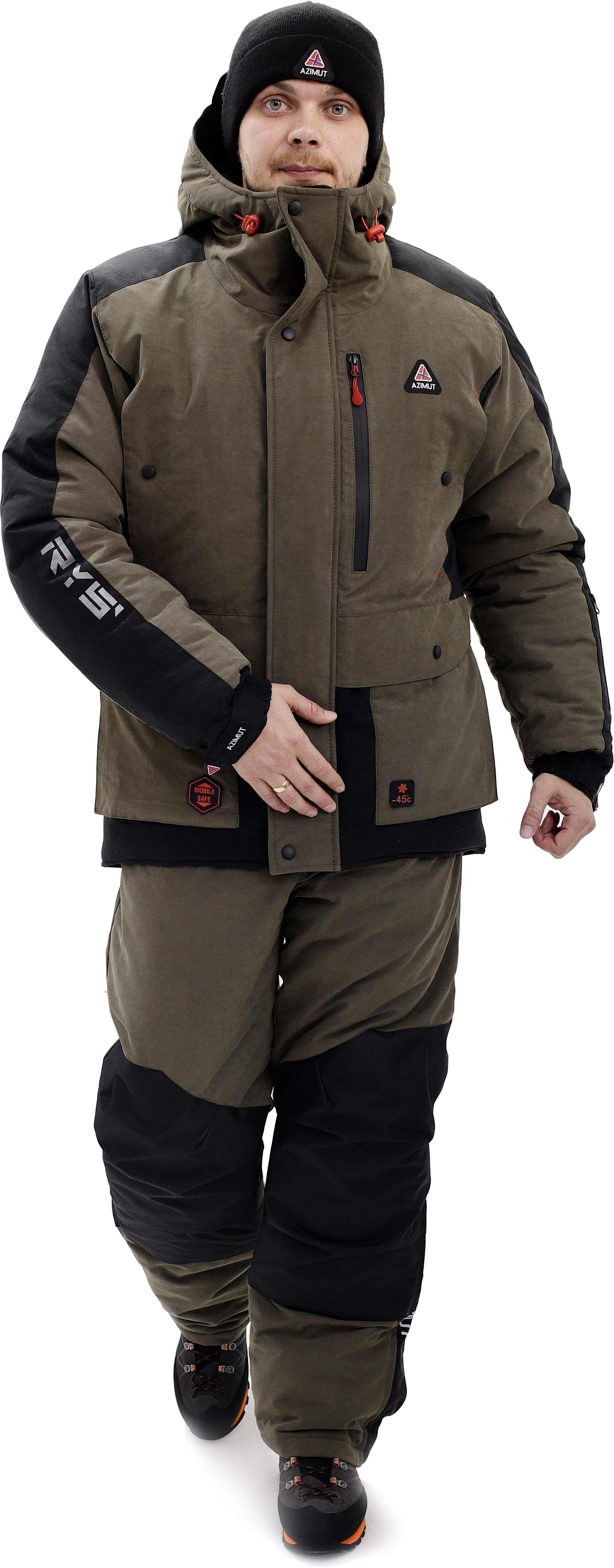 Куртка пять карманов, один из них на рукаве. Подклад капюшона - флис, регулировка по овалу лица. Куртка имеет вшитый внутренний термометр. А также Радио-экранирующий карман на молнии для смартфона. Подклад в куртке Hi-Tech (фольгированный). Внутри куртки ветрозащитная юбка. Высокий воротник. Полукомбинезон высокий имеет три кармана на молниях, регулировка пояса патами. С боков ПК трикотажные вставки для удобства наклона. На коленях вставки из ПВХ-4мм. Низ брючин расстегивается, имеет внутренние гетры от снега. Температура -45С. Ткань Норвегия 65%пэ, 35% нейлон, пл. 210 г/м2, мембрана 10000/10000 мм. Утеплитель TermoWool.