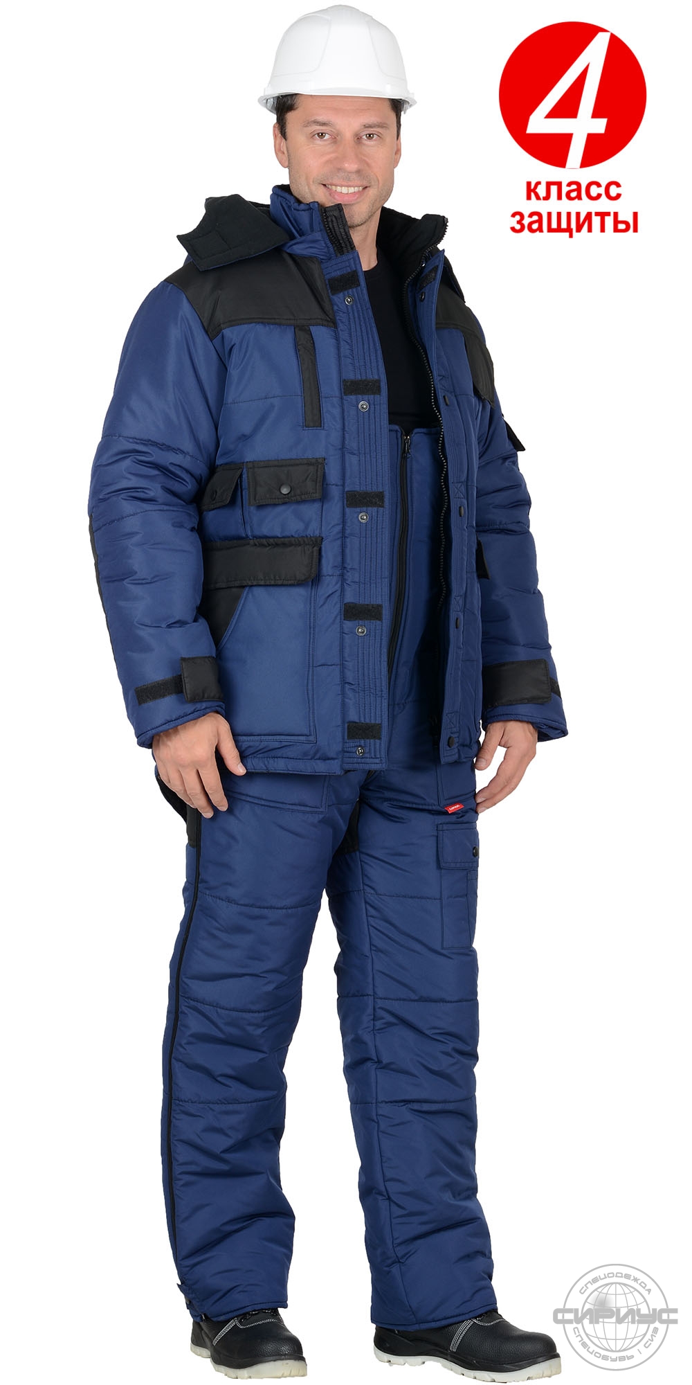 Комплектность — Куртка, полукомбинезон¶Ткань/Материал верха — 100% п/э., Состав — 100% ПЭ., Плотность — 130 г/кв.м.¶Цвет — Синий, Цвет отделки — Черный¶Подкладка — 100% п/э + флис¶Утеплитель/Наполнитель — Термофилл 150 гр/м.кв¶Пакет утеплителя — куртка - 3 слоя, п/к - 2 слоя Костюм зимний состоит из удлинённой куртки и полукомбинезона. Куртка утепленная, с застёжкой на молнию с двумя ветрозащитными внешними планками с застежкой на кнопки и липучки, низ куртки со стороны спинки удлинённый. Курта с различными функциональными карманами, с воротником стойка, со съёмным утеплённым капюшоном, рукава куртки с внутренними трикотажными манжетами, Внутренний воротник, внутренний капюшон, верхняя часть подкладки куртки из ФЛИСа. Подкладка куртки с двумя внутренними карманами с молнией и с ветрозащитной юбкой. Полукомбинезон утепленный, с бретелями, с центральной застежкой на молнию и внутренней ветрозащитной планкой, с боковыми карманами, с резинкой по линии талии спинки для лучшего прилегания.