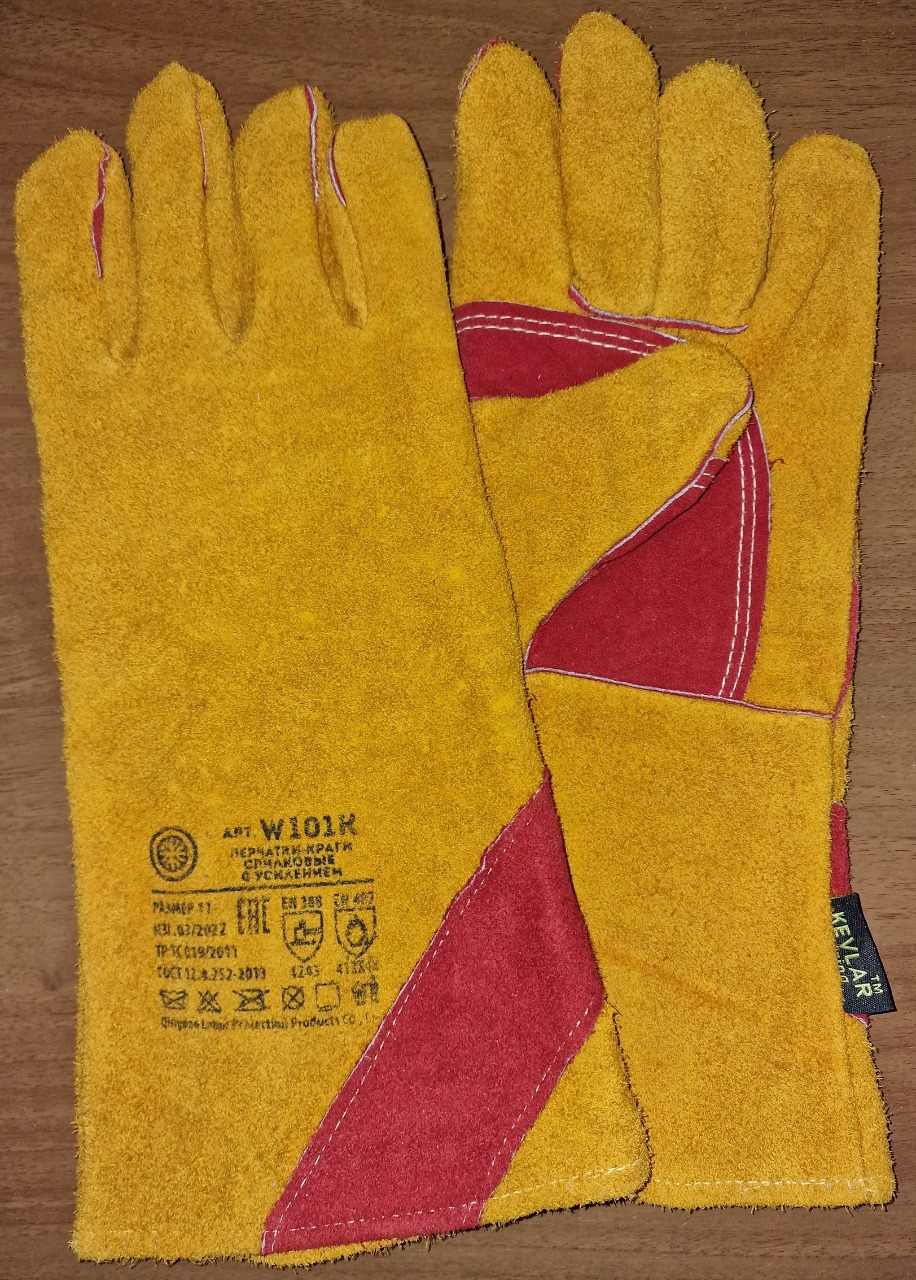 Краги из высококачественного спилка толщиной 1,1 – 1,3 мм, длина 35см. Швы защищены кантом из спилка для предотвращения попадания искр и брызг металла, Подкладка из искусственного меха.