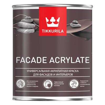 Facade Acrylate – Фасад Акрилат Универсальная водно-дисперсионная акрилатная краска для интерьерных и фасадных работ для окраски минеральных и деревянных поверхностей. Тип Водно-дисперсионная акрилатная краска. Область применения Для наружных работ: окраска фасадов, цоколей жилых, торговых, промышленных, складских и др. помещений по бетону, штукатурке, минеральным и акриловым декоративным материалам, фиброцементным плитам, вертикальным деревянным поверхностям из вагонки, строганным и пиленым дощатым фасадам, а также по балкам и откосам, подверженным атмосферным нагрузкам. Для внутренних работ: окраска стен и потолков внутри жилых, торговых, промышленных, складских и др. помещений, в том числе с повышенной влажностью, по бетонным, кирпичным, оштукатуренным, зашпатлеванным поверхностям, гипсокартону, ДСП и ДВП плитам. Также используется для отделки ранее окрашенных водно-дисперсионными красками прочно держащихся поверхностей (после предварительного зашкуривания). Объекты применения Для применения в местах общего пользования (межквартирных коридорах, лестничных клетках, холлах и вестибюлях). Краска не рекомендуется для отделки поверхностей, ранее окрашенных известковыми, силикатными красками и органическими эластичными покрытиями. Цвета Колеруется по фасадным и интерьерным каталогам Tikkurila. Для получения пастельных и насыщенных оттенков воспользуйтесь компьютерной колеровкой Tikkurila. База A также может использоваться в качестве белой краски. База C используется только в колерованном виде! При окрашивании в яркие цвета на базе С, рекомендуется предварительно нанести слой краски базы А, заколерованной в похожий оттенок. Цветовые каталоги Почувствуй цвет и Каталог цветов для минеральных поверхностей ”Фасад" Степень блеска Глубоко матовая Расход 6-9 м²/л по ровной невпитывающей поверхности; 4-6 м²/л по неровной впитывающей поверхности. На расход влияют шероховатость и пористость окрашиваемой поверхности, а также метод и условия при окраске. Тара 0,9л, 2,7л, 5л, 9л Разбавитель Вода Способ нанесения Наносится кистью, валиком или распылением. При нанесении распылением применять сопло 0,018"–0,023", т.е. 0,450–0,580 мм. Время высыхания При (20±2) ºС: 2 часа. Следующий слой можно наносить через 12 часов. При температуре воздуха ниже 15°С и относительной влажности воздуха выше 65% следующий слой наносить не ранее, чем через 24 часа. Водопроницаемость (EN 1062-3) w ≤ 0,1 kg/m2h0.5, III class Сопротивление водяному пару (EN ISO 7783) 0,14≤Sd,H2О <1,4 m, II class Стойкость к мытью Краска образует покрытие, устойчивое к многократному интенсивному мытью с применением бытовых неабразивных моющих средств (1 класс стойкости к мокрому истиранию по стандарту ISO 11998/ DIN EN 13 300). Заданный уровень устойчивости покрытия к мытью достигается через 4 недели. После мытья допускается небольшое изменение блеска покрытия. Выдерживает более 10000 проходов щеткой по стандарту DIN 53778 T2 Сухой остаток Около 58% Плотность 1,28-1,39 кг/л. Хранение При температуре выше 5ºС в плотно закрытой таре, предохраняя от воздействия влаги, тепла и прямых солнечных лучей. Срок годности 3 года со дня изготовления в невскрытой заводской упаковке.