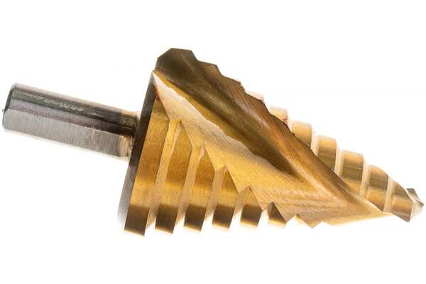 Ступенчатое сверло предназначено для получения отверстий различного диаметра без перестановки режущего инструмента. На каждой ступени есть маркировка фактического диаметра. Сверло изготовлено из быстрорежущей инструментальной стали. Количество ступеней — 9шт. Ход — 2 мм.