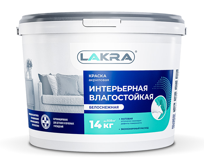 Краска АКРИЛОВАЯ интерьерная влагостойкая белоснежная 1,3кг Лакра/6