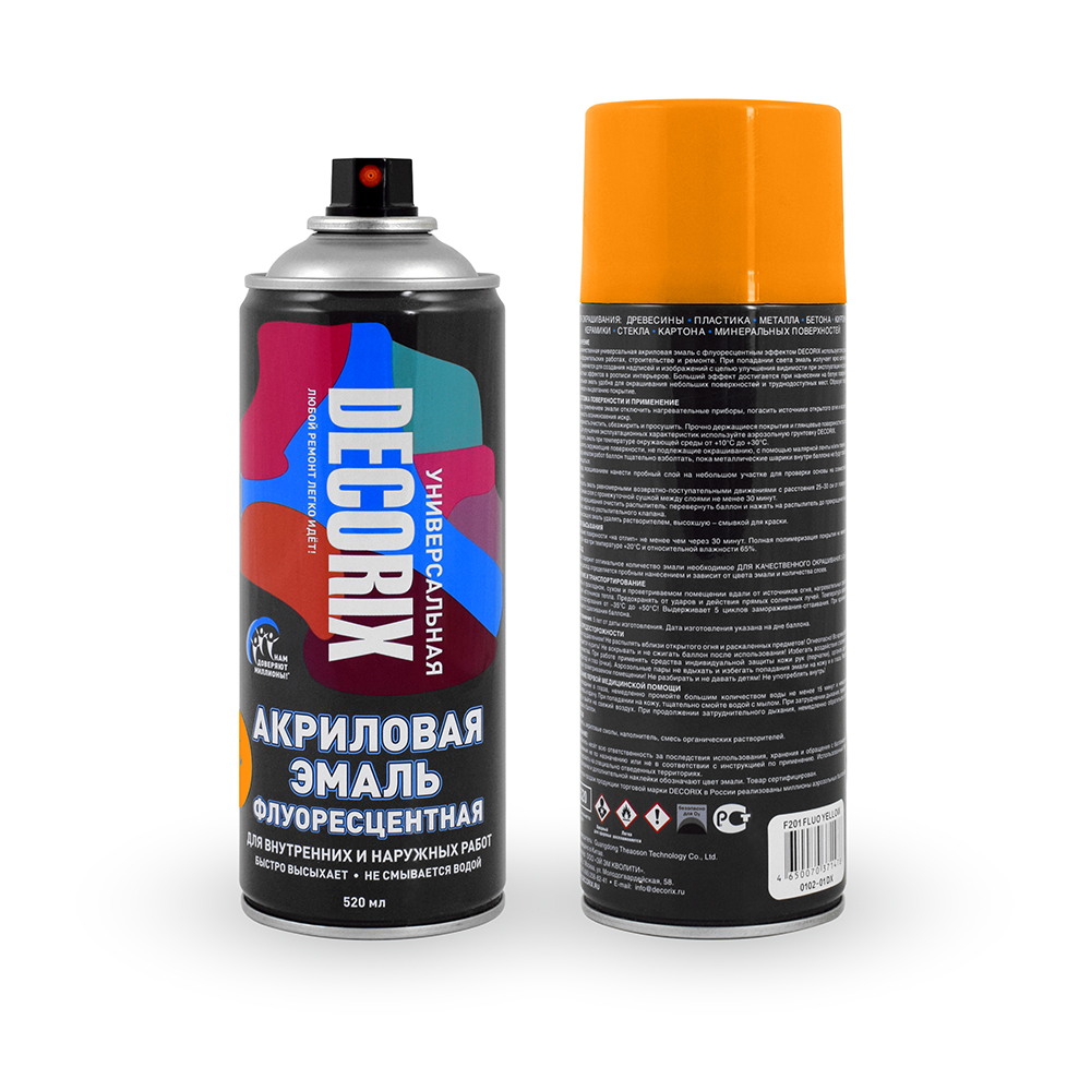 Высококачественная универсальная акриловая эмаль с флуоресцентным эффектом DECORIX используется в декоративно-оформительских работах, строительстве и ремонте.