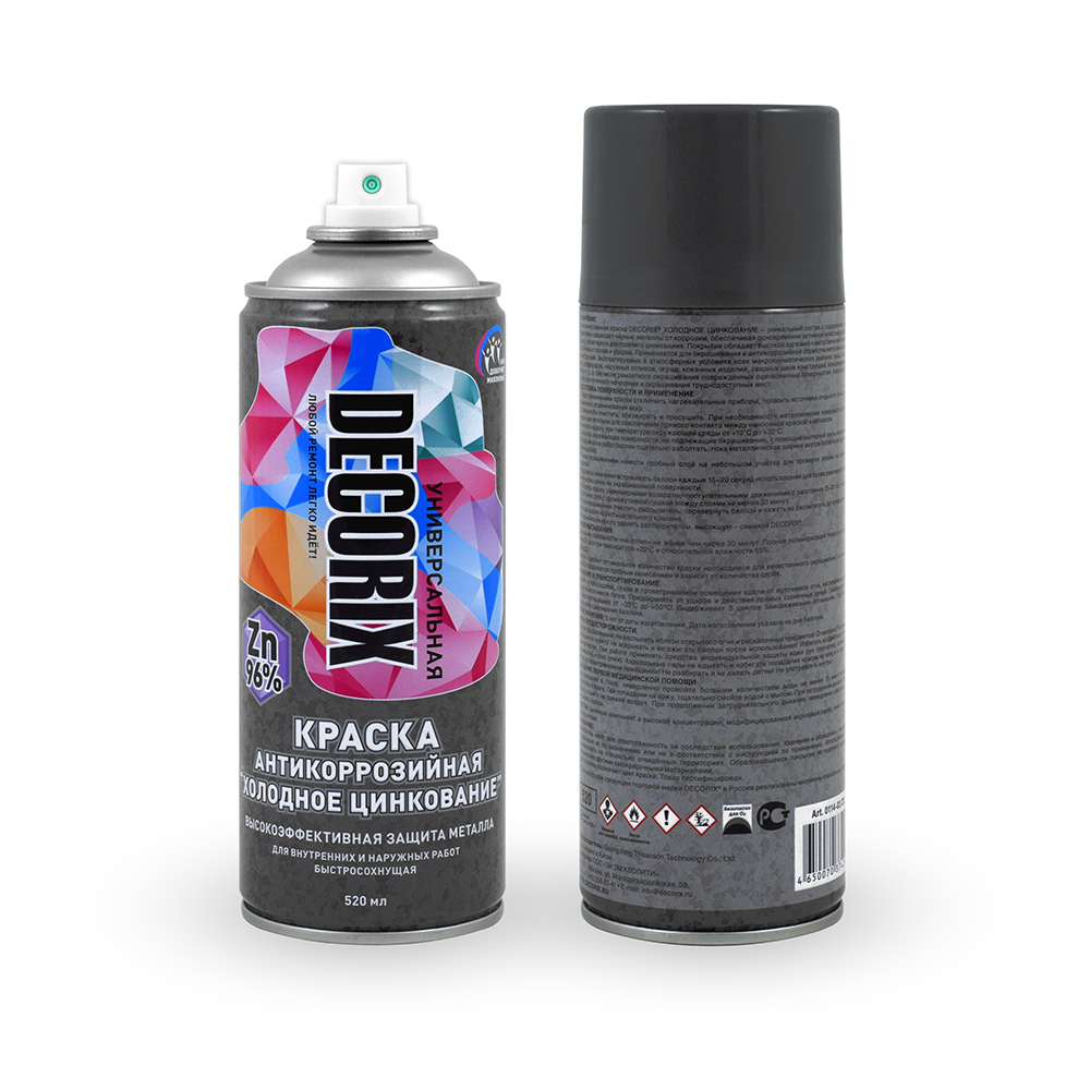 Высококачественная краска DECORIX® «Холодное цинкование» – уникальный состав с содержанием цинка 96% эффективно защищает чёрные металлы от коррозии, обеспечивая одновременно активную и пассивную (барьерную) защиту, характерную для горячего цинкования.