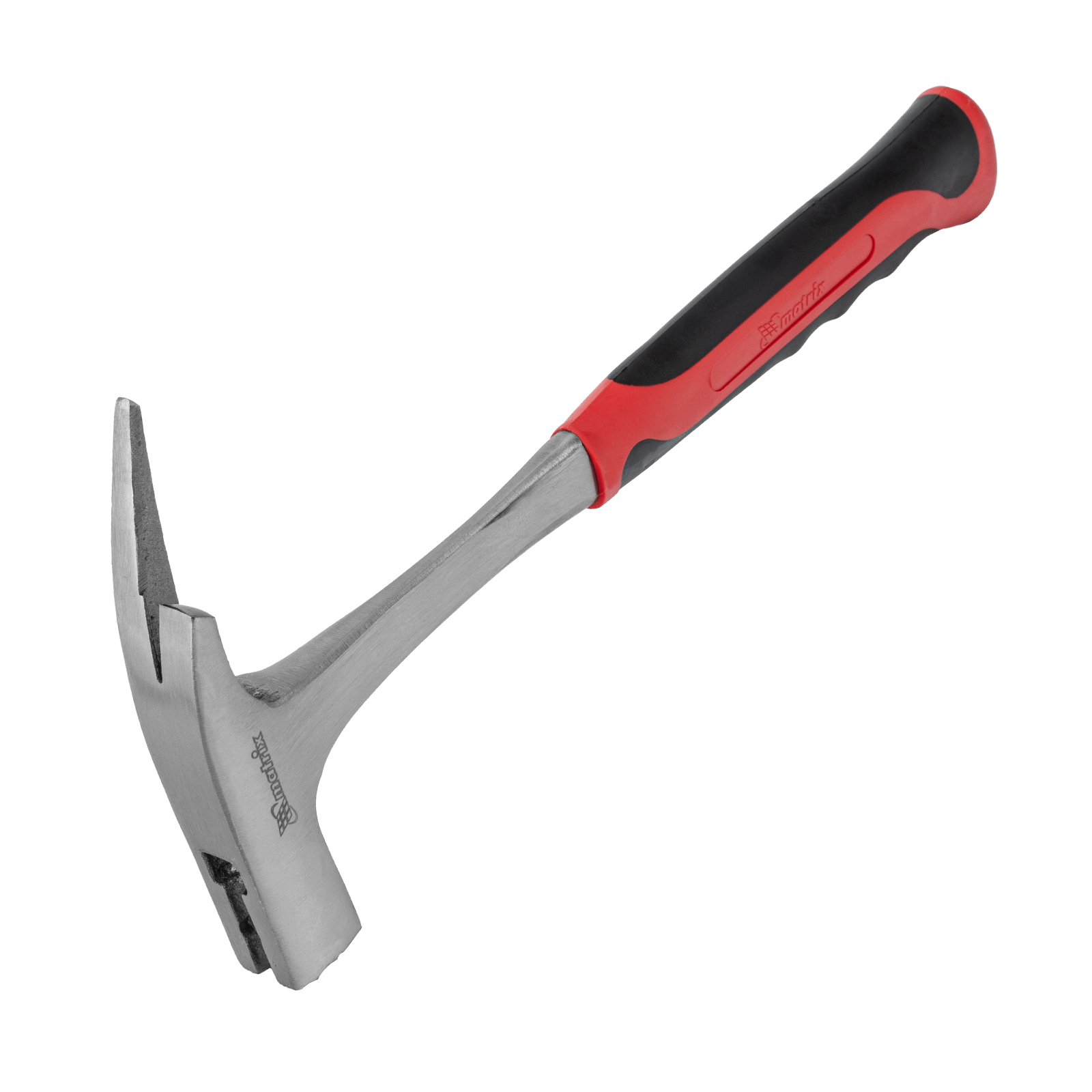 Цельнометаллический молоток кровельщика Matrix с головкой весом 600 г и двухкомпонентной рукояткой — специализированный инструмент для кровельных работ. Насечки на рабочей поверхности бойка предотвращают соскальзывание, если удар по гвоздю нанесен под углом. Противоположная часть головки представляет собой заостренный клин для пробивания отверстий в листовом металле и отгибания кромок. Гвоздодер позволяет вытягивать неправильно забитые гвозди для их выпрямления.