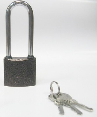 Материал - сталь с полимерным покрытием Ширина - 40мм Высота - 94мм Диаметр душки - 6мм Типа запирания - автоматический Ключи - 3 латунных (англ.тип)