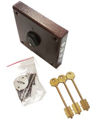 б/к - без козырька, б/о - без ответной планки (запорной коробки) Замок накладной десяти сувальдный с четырьмя цилиндрическими засовами диаметром 17мм. Устанавливается на дверях любой конструкции толщиной не более 55мм. Замок запирается ключом как с наружной так и с внутренней стороны на четыре фиксируемых положения. Габариты: 150*140*68 установочные размеры: 120*116мм.