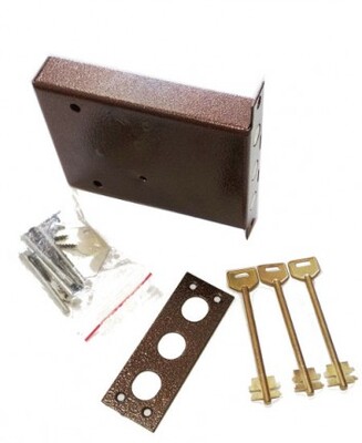 Замок накладной семи сувальдный с тремя цилиндрическими засовами диаметром 17 мм. Устанавливается на металлических дверях. Замок закрывается и открывается с наружной стороны поворотом комплектного ключа на три фиксируемых положения. Ключ имеет сложную несимметричную нарезку.Габариты 184*165*36. 3 ключа.
