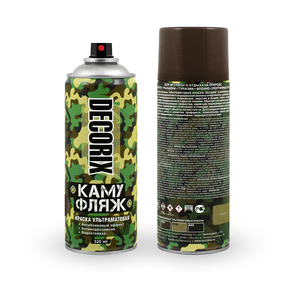 Высококачественная ультраматовая краска DECORIX® камуфляжная предназначена для маскировочного окрашивания военно-спортивного, рыболовно-охотничьего и экспедиционного снаряжений, укрытий и вышек, лодок, вездеходов, квадроциклов, внедорожников и другой техники. Образует ультраматовую поверхность со светопоглощающим эффектом, идеально подходящую для камуфляжа. При правильно подобранных сочетаниях и площади закрашивания цветов краска максимально маскирует объекты на местности. Для создания камуфляжа используйте листья и ветки в качестве трафарета. Аэрозольная краска удобна для локального окрашивания и окрашивания труднодоступных мест.