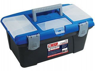 Для хранения и транспортировки различного инструмента. Снабжен тремя органайзерами с прозрачными крышками, два из которых съемные. Возможность запирания на навесной замок. Комплектуется съемным лотком.
