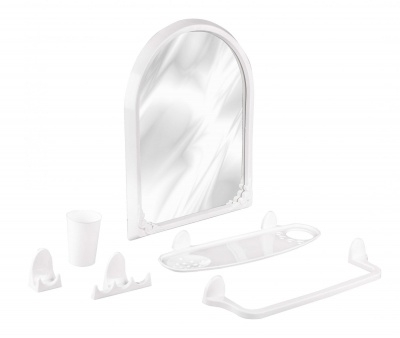 Набор для ванной комнаты с зеркалом позволит вам иметь все необходимые в ванной аксессуары, оформленные в едином стиле. В него входят полочки, держатели для полотенец и туалетной бумаги и другие мелочи. Набор изготовлен из светлого пластика и отлично смотрится в интерьерах, оформленных в современном стиле.