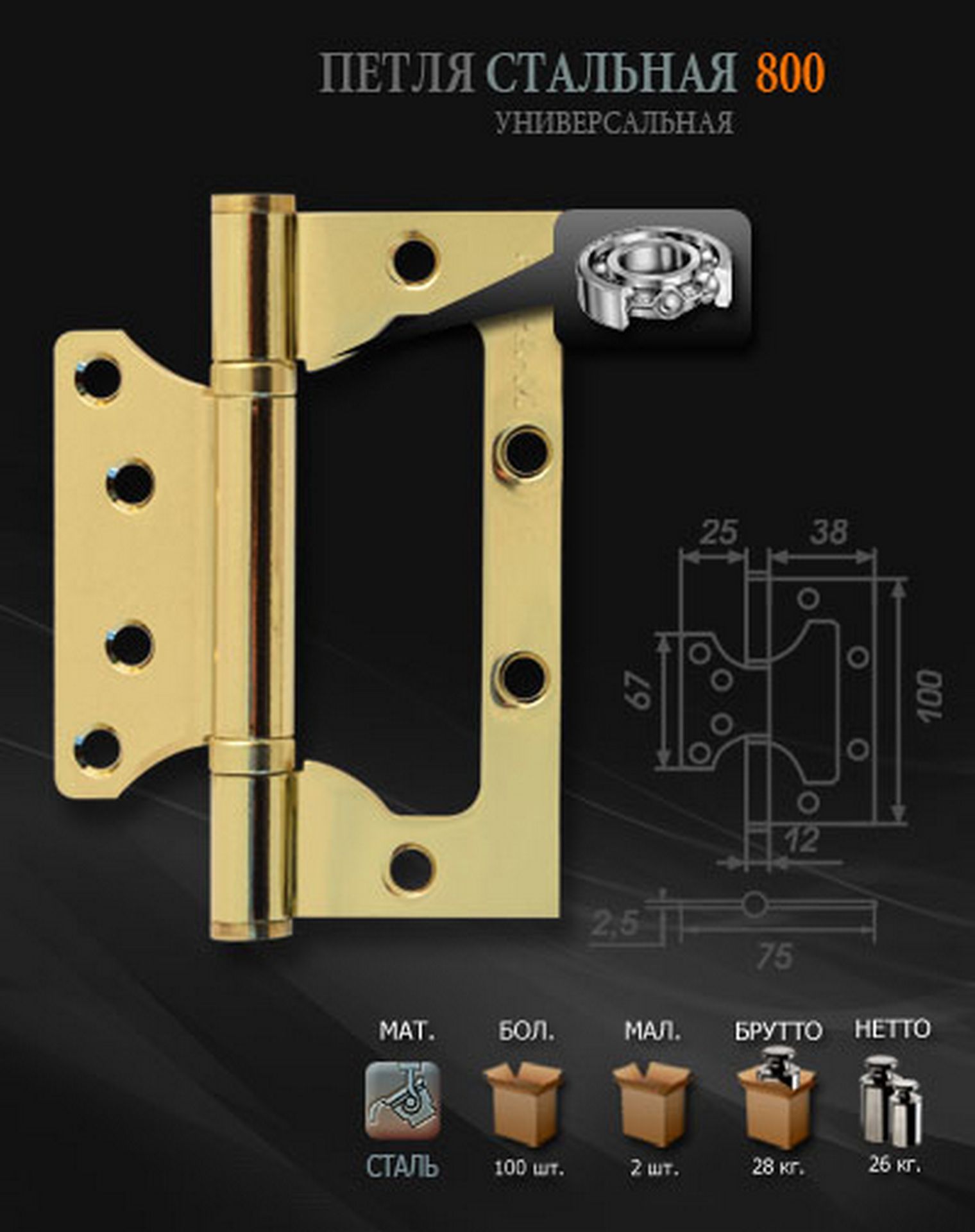 Петля универсальная 800 FHP АС 100х75х2,5мм покрытие медь без кол НОРА-М