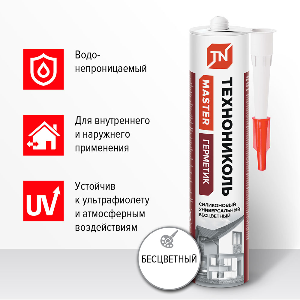 Герметик ТЕХНОНИКОЛЬ универсальный силиконовый бесцветный это силиконовый герметик, который при взаимодействии с влагой воздуха формируется в прочную эластичную резину. Стоек к ультрафиолету и атмосферным воздействиям. Температура эксплуатации от минус 40°С до плюс 80 °С.