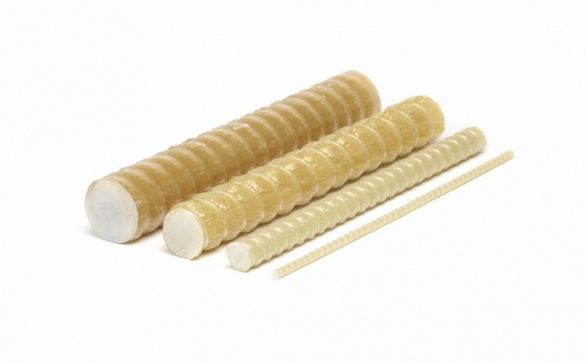 круглые профили-стержни с поперечными выступами, идущими по винтовой линии. Поперечные выступы дают лучшее сцепление с бетоном. У композитной арматуры прочность на разрыв в 3 раза выше прочности стальной арматуры класса A3, коррозионные свойства на уровне хорошей нержавеющей стали, а вес, в равнопрочном соотношении, меньше в 11 раз.